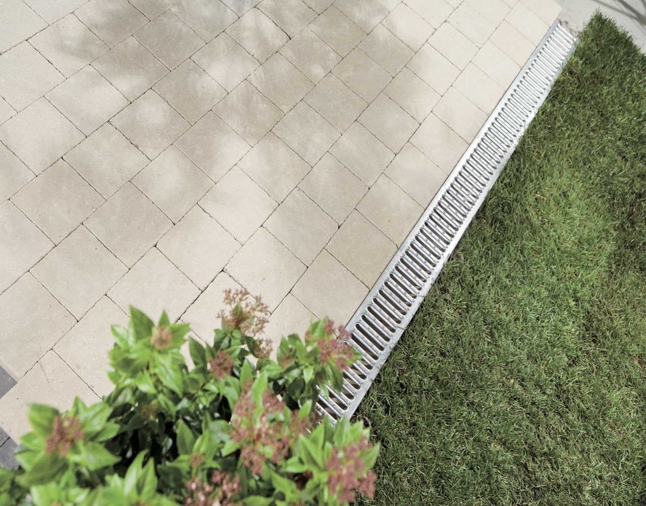 AVANT DE COMMENCER VOTRE PROJET : il est conseillé d’élaborer un schéma avec les dimensions et l’implantation. Les dimensions extérieures sont délimitées avec des piquets. La hauteur du pavage peut y être indiquée et reportée à l’aide d’un niveau et des lattes d’alignement, d’un niveau à eau ou d’un laser. Lorsque vous posez un revêtement extérieur, tenez également compte d’une pente de 1 à 2 cm par mètre pour l’évacuation de l’eau. Veillez à ce que l’évacuation s’écoule toujours depuis l’habitation. Prévoyez l’évacuation à tous les niveaux de la structure, et aussi dans les fondations. Le niveau du pavage à la façade ne peut jamais dépasser la membrane d’étanchéité.